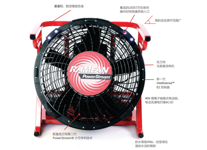 1、優蘭特EX50Li充電移動式消防排煙機配備可插拔的40V鋰離子電池組,可在4小時內充電;